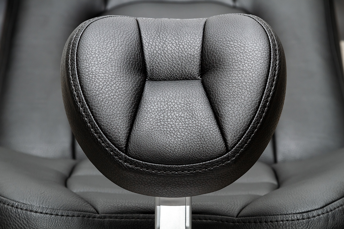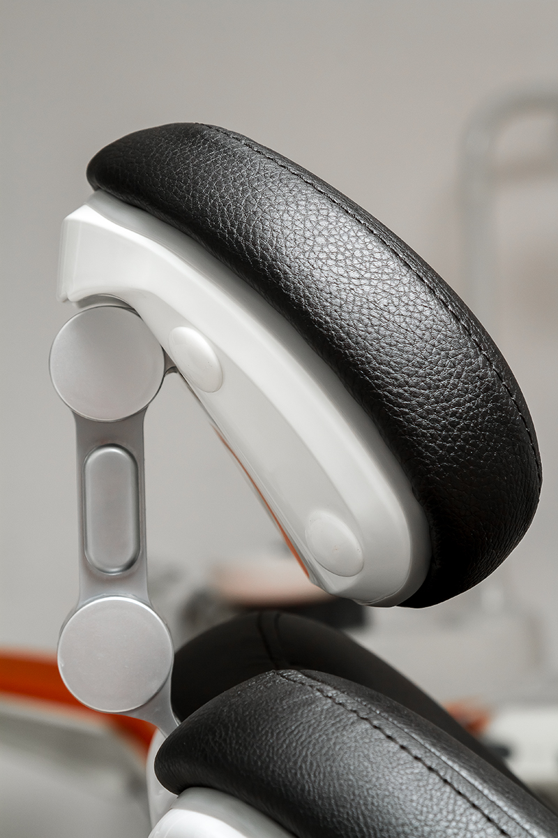 Подголовник на артикуляционном соединении имеет широкий диапазон регулировок: наклон, поворот, выдвижение. Он оснащен подвижными шарнирами (артикуляцией) для точной и надежной фиксации головы пациента в нужном положении.