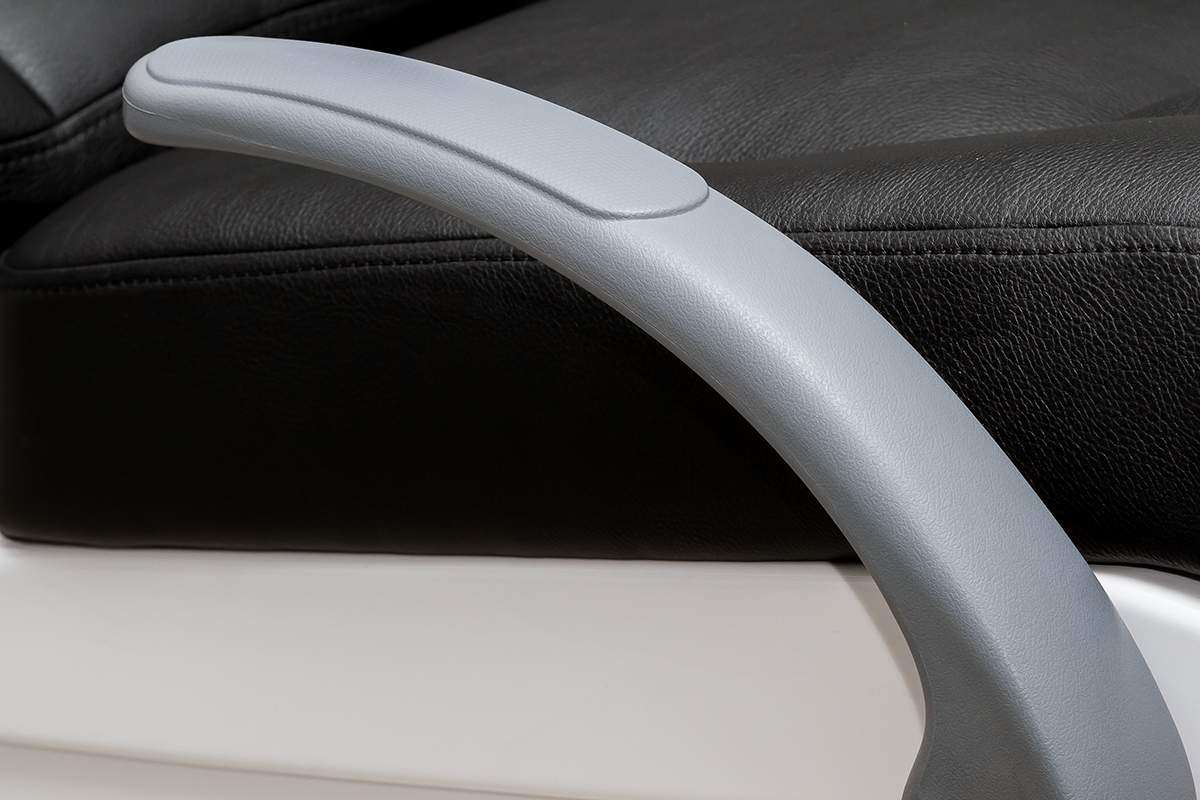 При изготовлении кресла используется экокожа, которая обладает рядом неоспоримых достоинств. Она обладает высокой износостойкостью (100 000 циклов по методу Шорса при соблюдении правил эксплуатации), благодаря чему прослужит долгое время. Боле того, такой материал отлично поддается обработке с помощью стерилизующих средств.