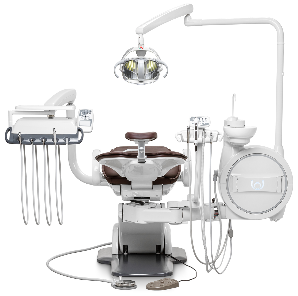 Главная особенность модели — система «Перформер», позволяющая переключать конфигурацию для врачей правши и левши без потери функциональности. Это решение делает установку по-настоящему универсальной. Чугунное основание и каркас кресла из алюминиевого сплава обеспечивают исключительную устойчивость.